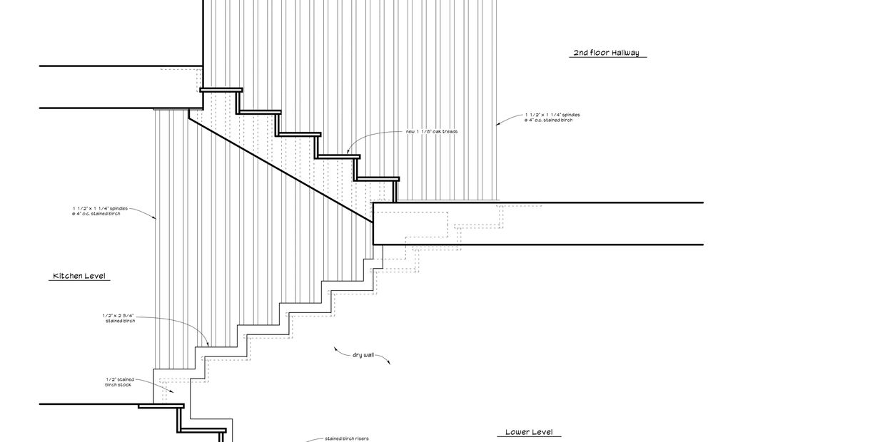 The architect designed a unique spindled wall between the second, first and lower level spaces to join them together and match an existing detail in the entry.